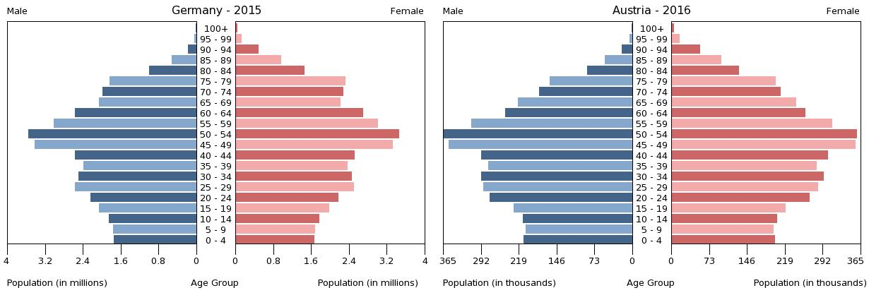 Österreich und Deutschland haben beide ein auf Umlage basiertes Rentensysteme. Was den demographischen Wandel angeht, so sind die Bevölkerungspyramiden beider Länder nahezu identisch. Das ist kein Zufall, da beide Länder eine ähnliche Geschichte haben. Dazu kommt dass das pro Kopf BIP beider Länder (2024) mit 56.717 US-Dollar (Deutschland) und 58.669 US-Dollar (Österreich) kum näher sein könnte. Die Rentenniveaus beider Länder könnten dagegen kaum anders sein.